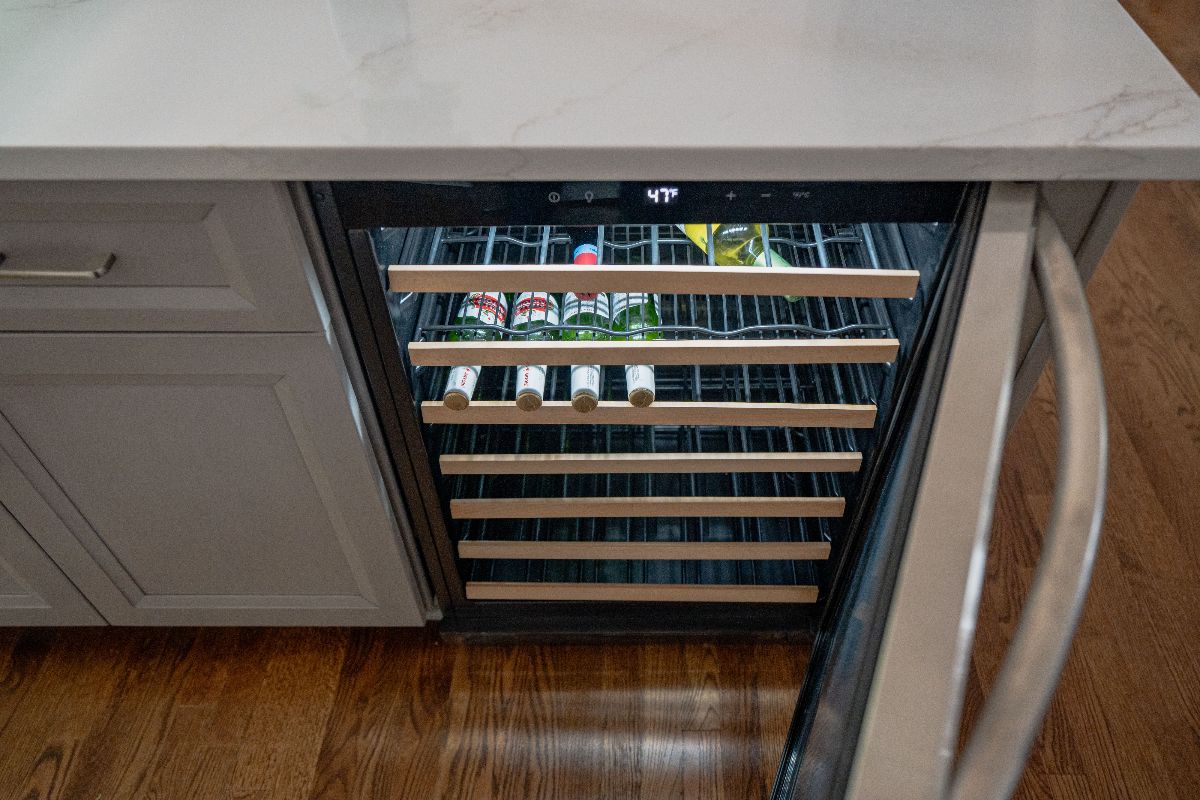 White Shaker Kitchen with Contrasting Island and Wine Storage